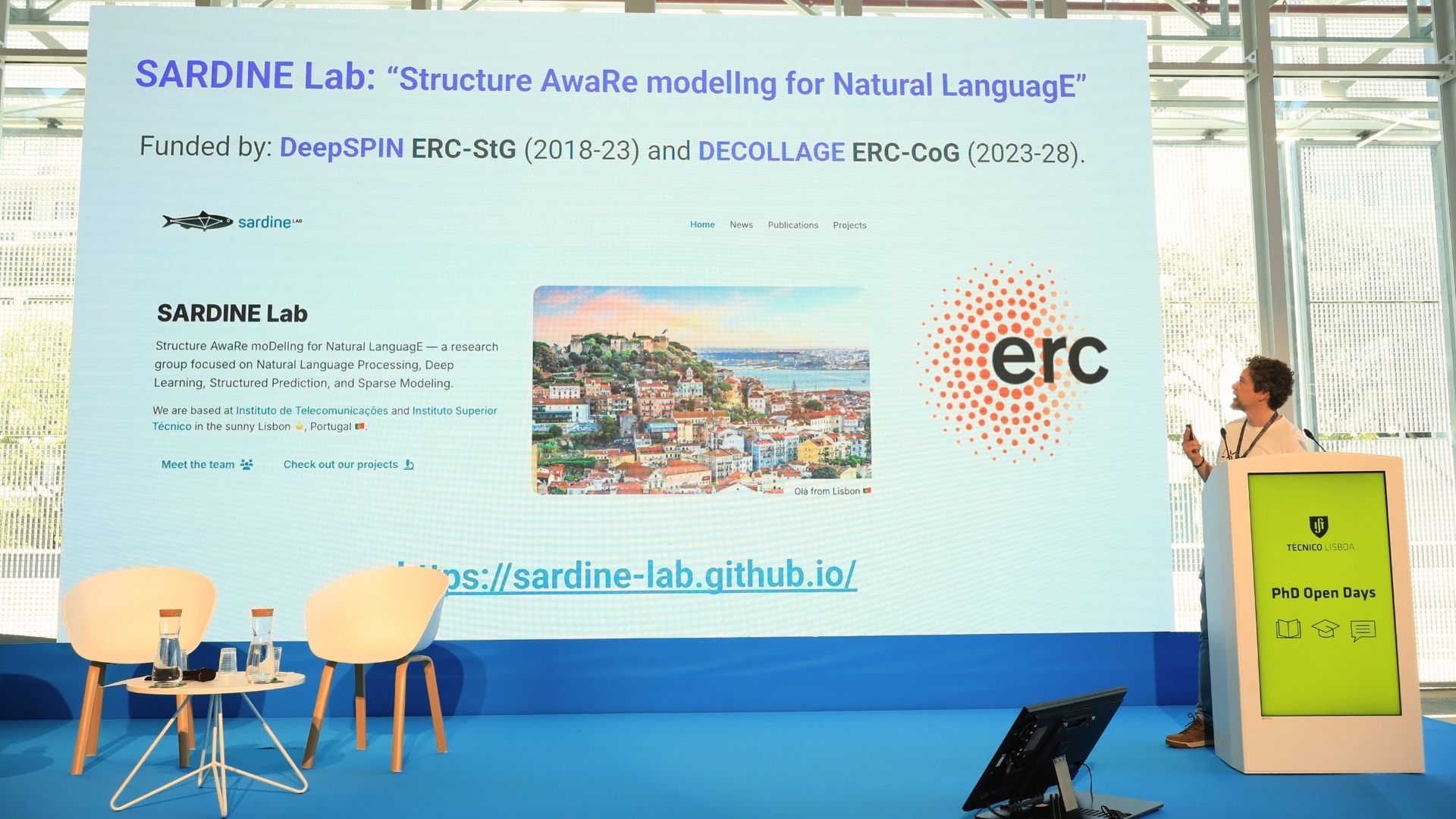 The second session of the PhD Open Days, Invited Talks: "From a PhD to an ERC Grant", featured the participation of André Martins, professor at the Department of Electrical and Computer Engineering and researcher at the Instituto de Telecomunicações, and Marco Piccardo, professor at the Department of Physics. During the session, André Martins shared insights into his career path — from completing his PhD in 2012 to joining the SARDINE Lab and the EuroLLM project, both supported by the European Research Council (ERC).