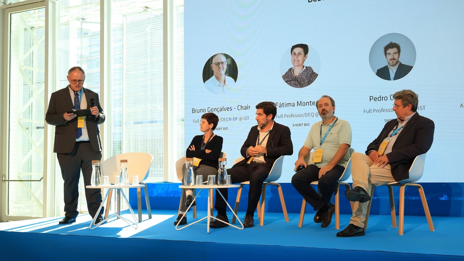 After the debate "Life and Health", the session "Clean Energies and Sustainability" took place, featuring Pedro Carvalho, faculty member of the Department of Electrical and Computer Engineering (DEEC) and researcher at INESC-ID, as well as Fátima Montemor, Tiago Domingos, and Manuel Duarte Pinheiro, faculty members at Técnico. The debate addressed the growth of renewable energies, the long-term changes required in the electricity grid, and the challenges researchers face in this field.