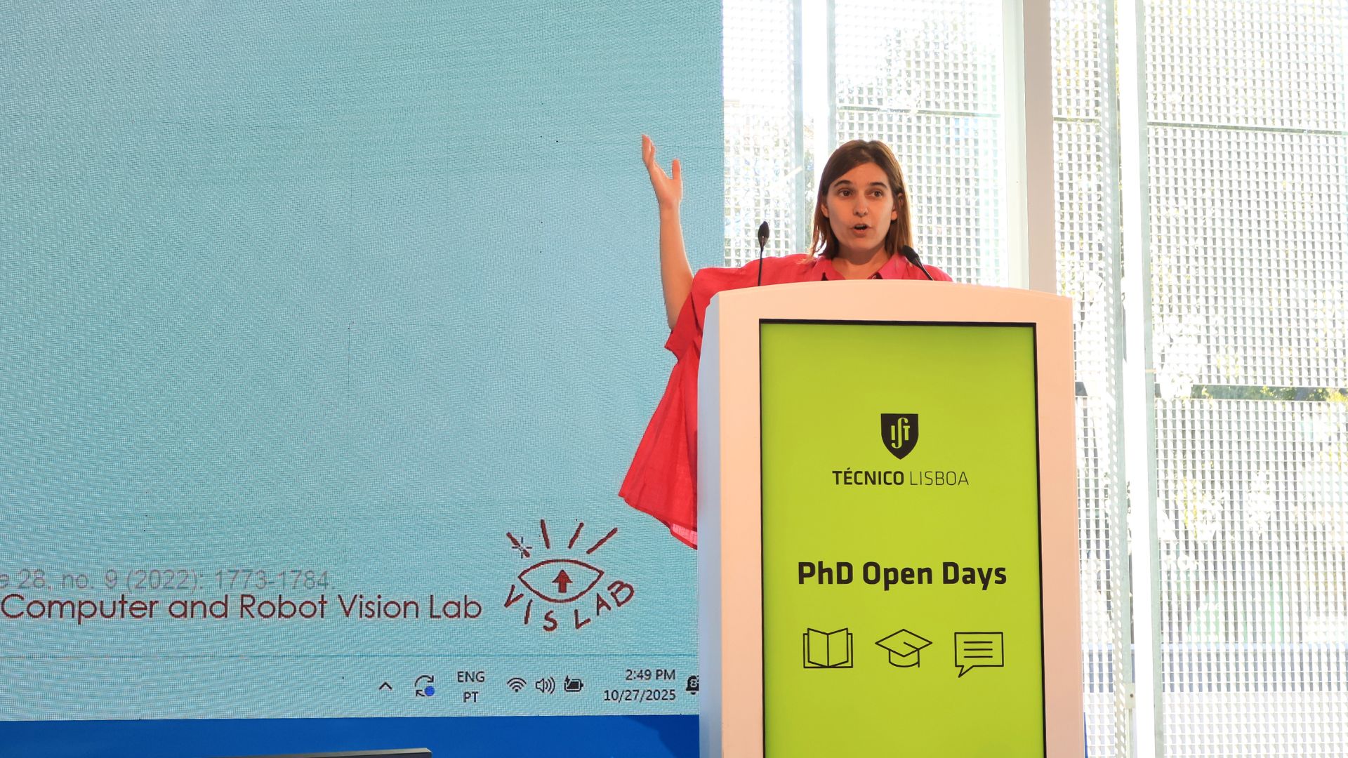 The afternoon of the first day of the PhD Open Days began with the debate “Life and Health.” The session featured the participation of Catarina Barata, professor at the Department of Electrical and Computer Engineering and researcher at the Institute for Systems and Robotics (ISR), as well as Jorge Martins and Cláudia Lobato, both professors at Técnico. Moderated by João Sanches, the debate emerged from the need to address the challenges faced by today’s society — such as global pandemics, the growing number of chronic diseases, the demand for less invasive treatments, and more personalized therapies for expanding populations. In this context, the moderator highlighted the role of researchers in developing solutions using computing, data analysis, artificial intelligence, and advanced materials, while taking into account factors such as efficiency, responsiveness to stimuli, cost, biocompatibility, and sustainability, as well as ethical considerations.