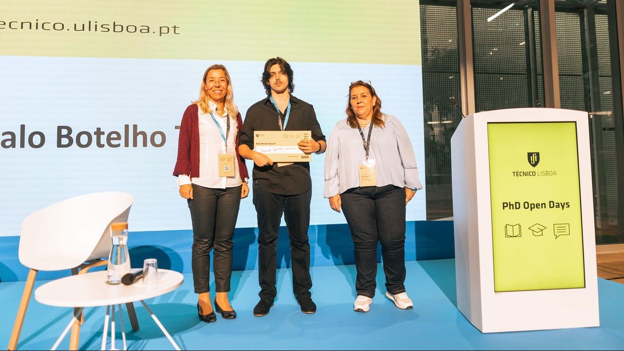 Community Gonçalo Botelho Teixeira and Pedro Martin recognized at the PhD Open Days Monday, November 3, 2025 4:08 PM PhD Open Days PhD students Gonçalo Botelho Teixeira vence o prémio de "Melhor póster científico" | Foto: Técnico